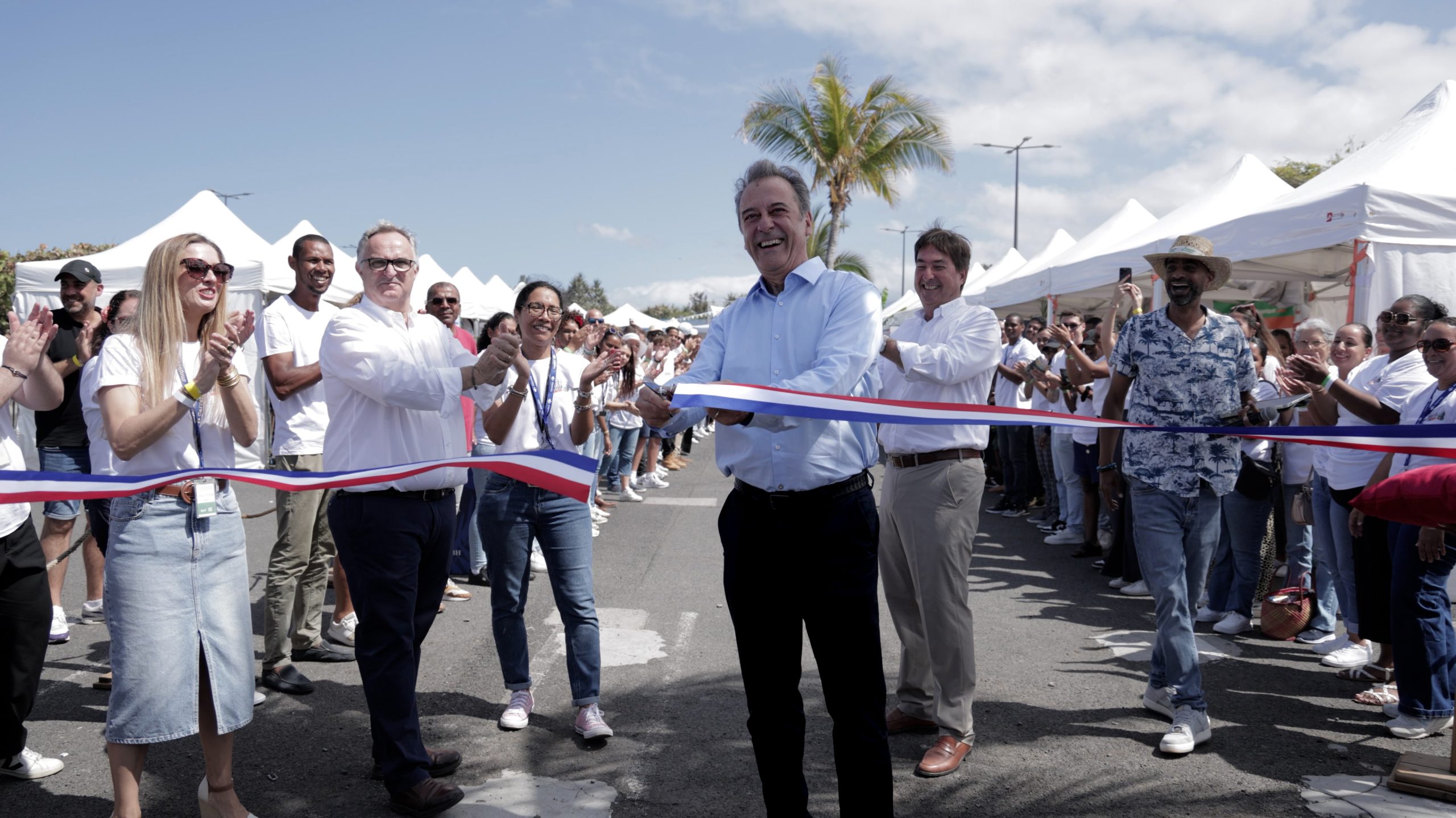 Michel Lapeyre, DG GBH Océan Indien et Afrique inaugure l'événement Réun’île en faveur de la production locale, entouré des équipes Carrefour Réunion, filiale de GBH : Émilie Picard, directrice marketing, Erwan Brenaut, directeur général adjoint, Amaury de Lavigne, directeur Carrefour Océan Indien - La Réunion, Carrefour Saint-Pierre, 12 octobre 2025.